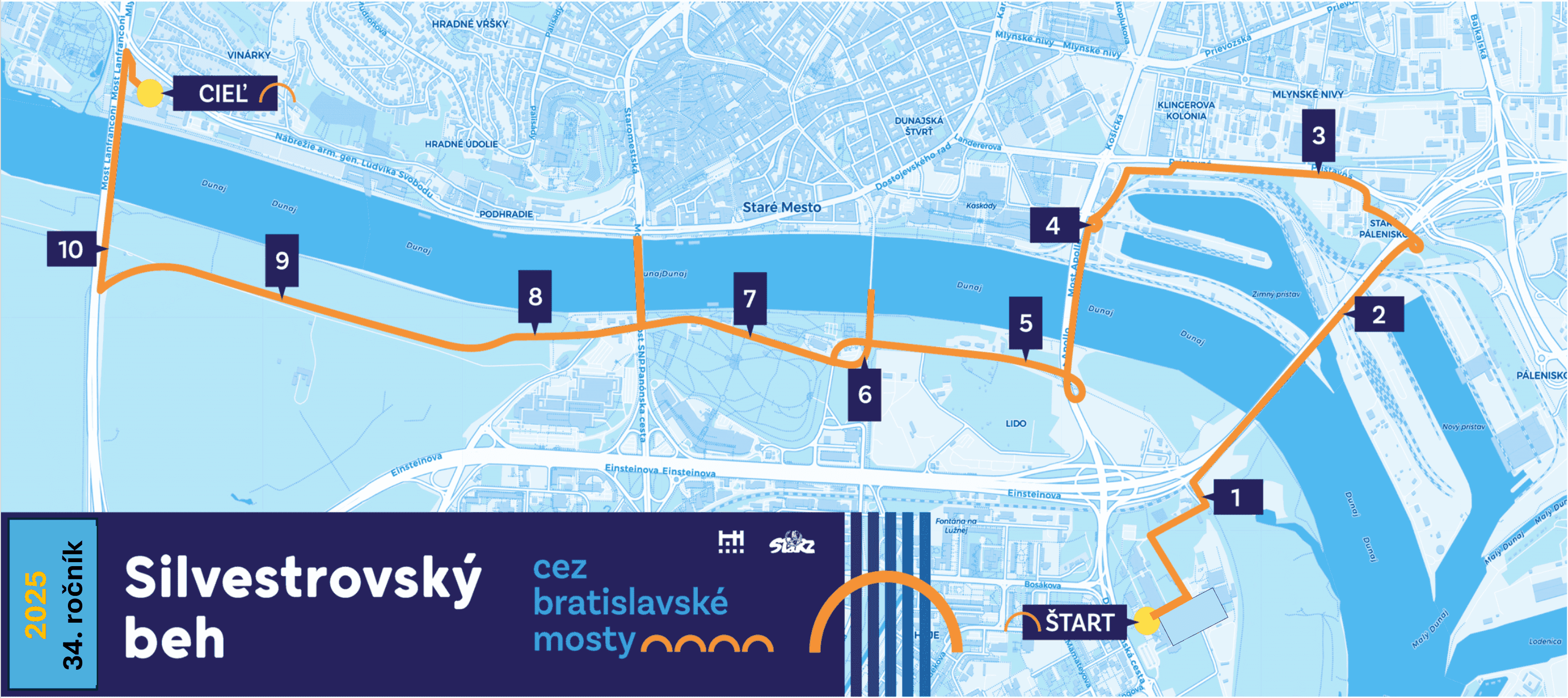 Trať 34. ročníka bude merať 11,5 km, pobeží sa cez päť mostov – Prístavný, Apollo, Starý, Nový a Lanfranconi – s cieľom na bežeckom ovále štadióna FTVŠ UK na Lanfranconi, kde sa uskutočnia detské súťaže SBCBM.